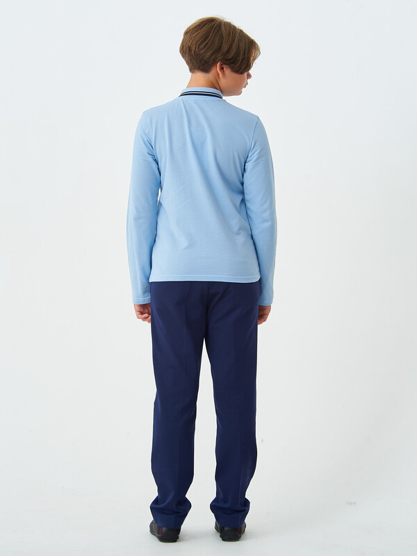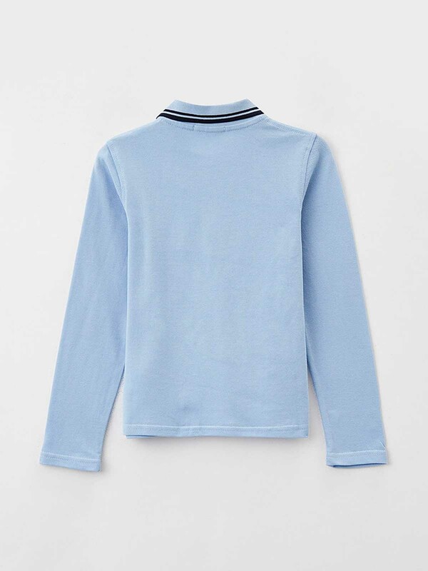 Поло из 100% хлопка с длинными рукавами, отложным воротником рубашечного типа, с центральной укороченной застежкой по переду на пуговицы. По краю воротника расположена контрастного цвета полоса.