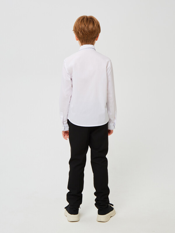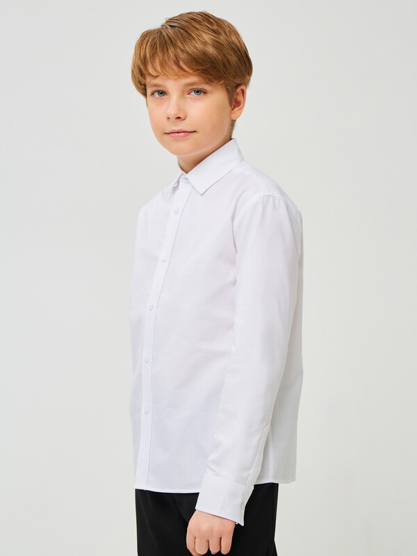 Сорочка для мальчика из смесового хлопка полуприлегающего силуэта. На спинке - кокетка. Воротник отложной со стойкой. Застёжка по центру переда на планку с кнопками. Рукава рубашечные со шлицами и манжетами.