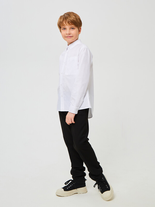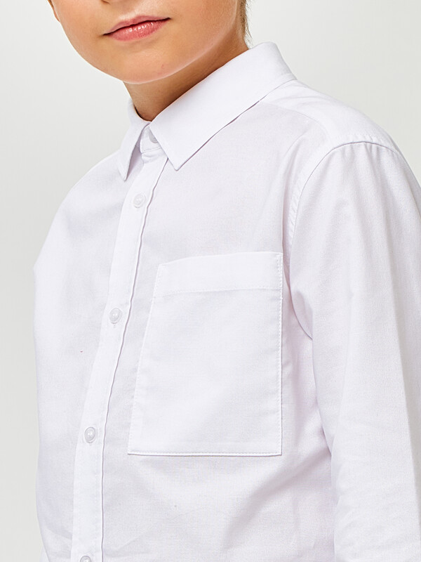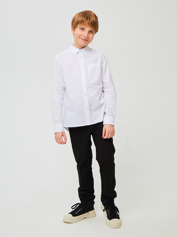 Сорочка для мальчика из смесового хлопка полуприлегающего силуэта. На спинке - кокетка. Воротник отложной со стойкой. Левая сторона полочки дополнена накладным карманом. Застёжка по центру переда на планку с кнопками. Рукава рубашечные со шлицами и манжетами.