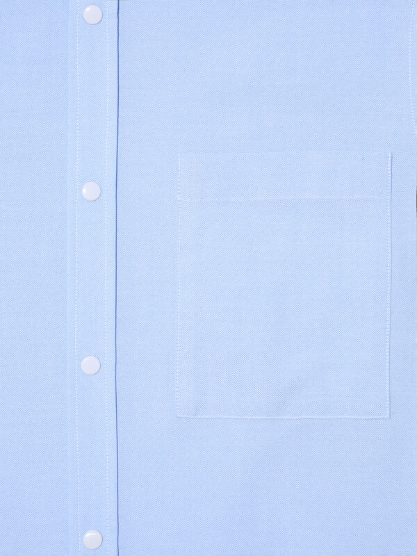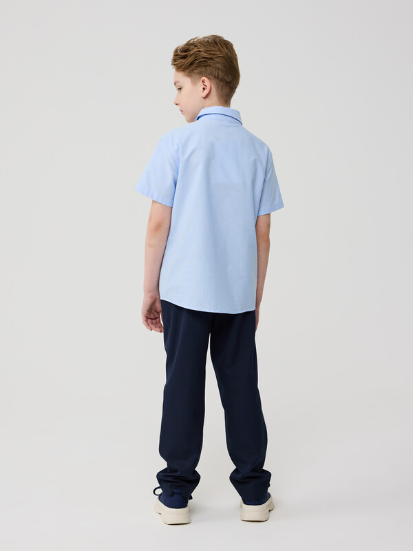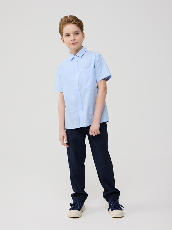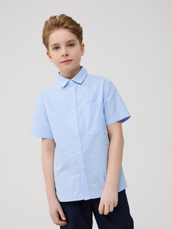 Сорочка для мальчика из смесового хлопка полуприлегающего силуэта с короткими рукавами. Воротник отложной со стойкой. Левая сторона полочки дополнена накладным карманом. Застёжка по центру переда на планку с кнопками.