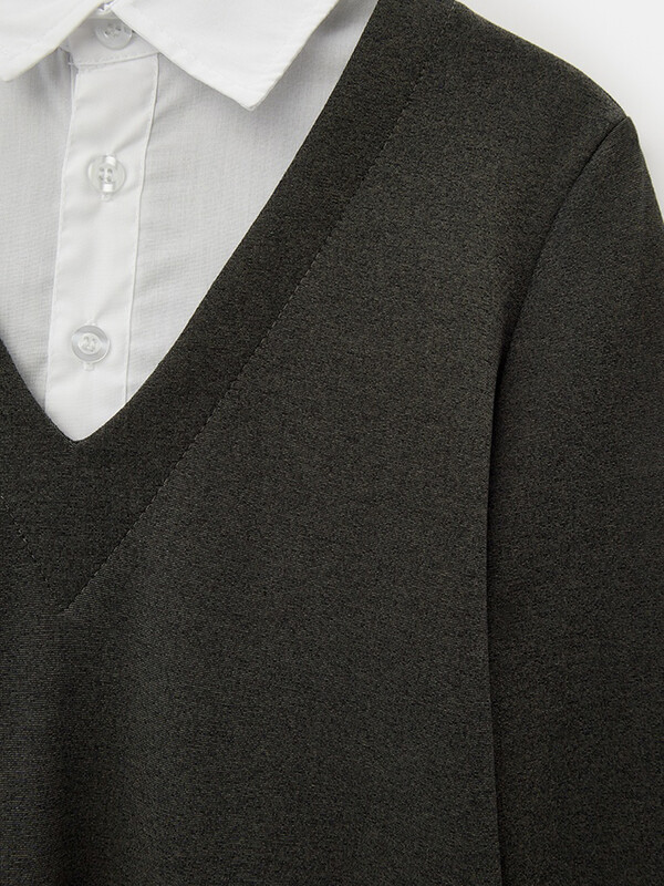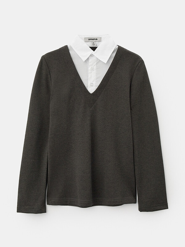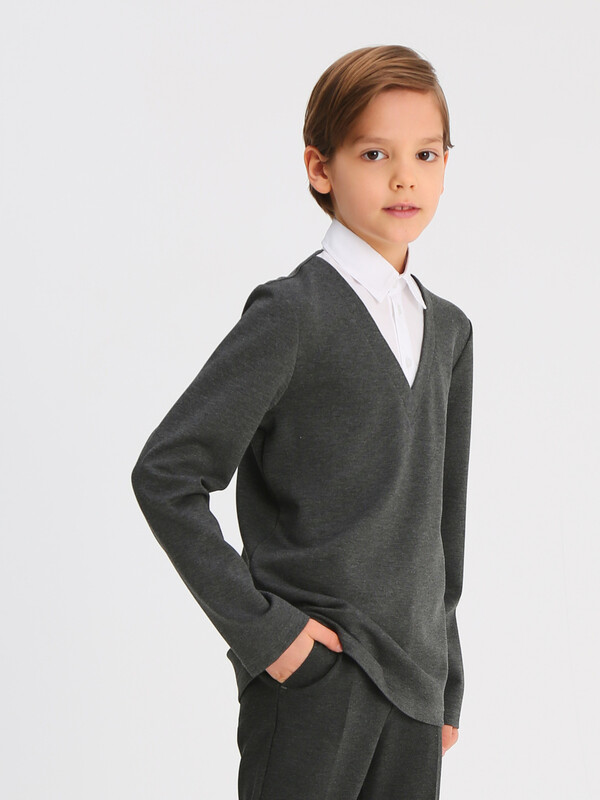 Джемпер трикотажный для мальчика прилегающего силуэта с имитацией манишки из сорочечной ткани контрастного цвета. Воротник отложной со стойкой. Укороченная застёжка на переде на планку с пуговицами. Рукава втачные длинные. Отличный вариант на каждый день.