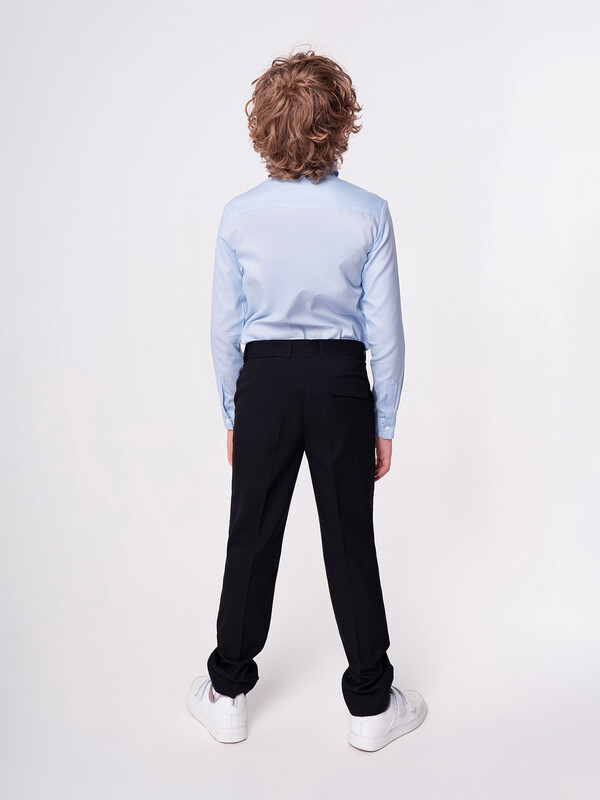 Классические брюки для мальчика из износостойкой и устойчивой к смятию костюмной поливискозы немного зауженные к низу. На передней части брюк боковые карманы, заглаженные стрелки и застёжка - гульфик на молнии. На правой задней половинке брюк - карман с клапаном, на втачном поясе с регулировкой и шлёвками. Отличный вариант на каждый день.