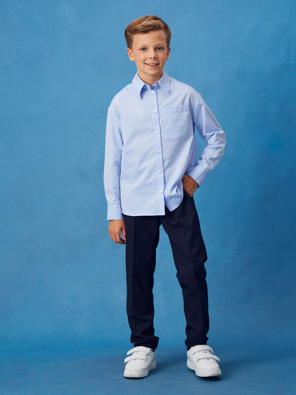 Брюки зауженные из трикотажа джерси для мальчика. Пояс с еврорезинкой сзади. На передней части брюк боковые карманы, горизонтальные защипы и застёжка - гульфик на молнии. На правой задней половинке брюк - карман с узкой листочкой. Отличный вариант на каждый день.