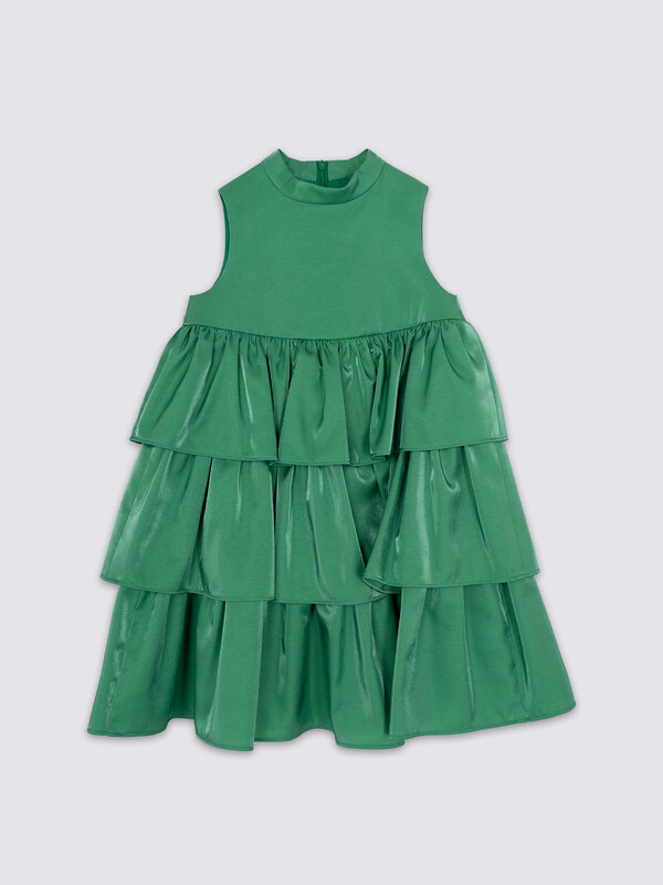 Платье А-силуэта из атласа, с юбкой "каскад" и воротничком стойка. Дополнено съёмным украшением на линии талии. Застежка по спинке на потайную молнию. Подкладка из хлопка