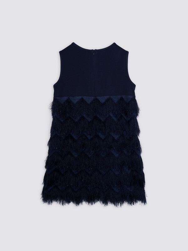 Платье с Высокой линией талии без рукавов. Верх трикотажного лифа украшают блестящие пайетки. Лиф облегает фигуру, создавая полуприталенный силуэт, который плавно расширяется к низу. Особенного внимания заслуживает юбка: она выполнена из ткани с длинным ворсом. Такой материал придаёт изделию дополнительную фактурность и необычность. Для обеспечения комфорта внутренняя часть юбки имеет приятную на ощупь подкладку из хлопка.