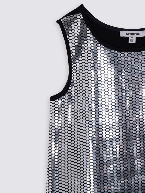 Трикотажное мини-платье без рукавов. Актуальная модель свободного силуэта, который слегка расширяется к низу, без застежки. Спереди на сарафане пайетки.