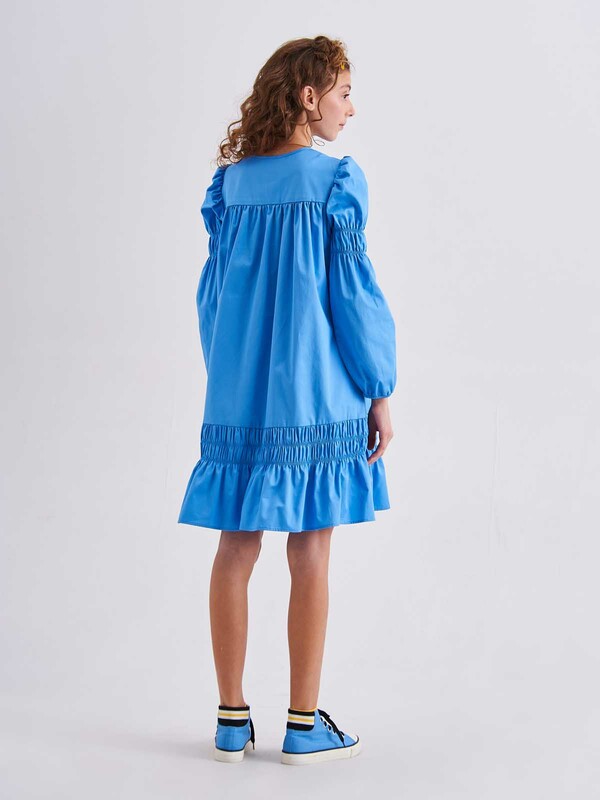 Стильное романтичное платье из хлопчатобумажной ткани свободного силуэта. Горловина на завязках, длинный объемный рукав собран на резинку, в боковых швах карманы. По волану платья и по рукаву идет резинка для создания эффекта буф.