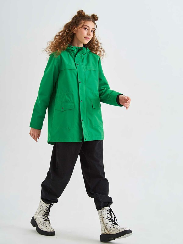 Куртка-ветровка на хлопковой подкадке c несъемным капюшоном. Внутри кулиска со шнурком для регулировки ширины изделия, в рукавах трикотажные манжеты, два накладных кармана с клапаном.