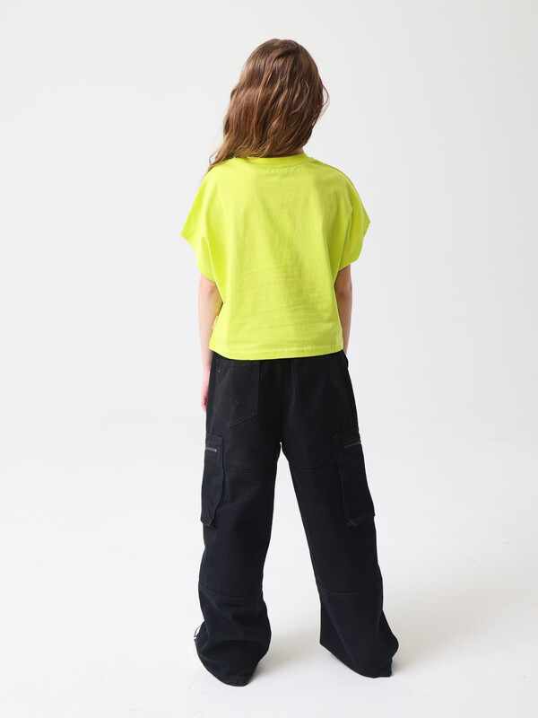 Футболка прямого кроя для девочек. Свободный прямой силуэт, приспущенное плечо и немного укороченные рукава для оверсайз посадки.