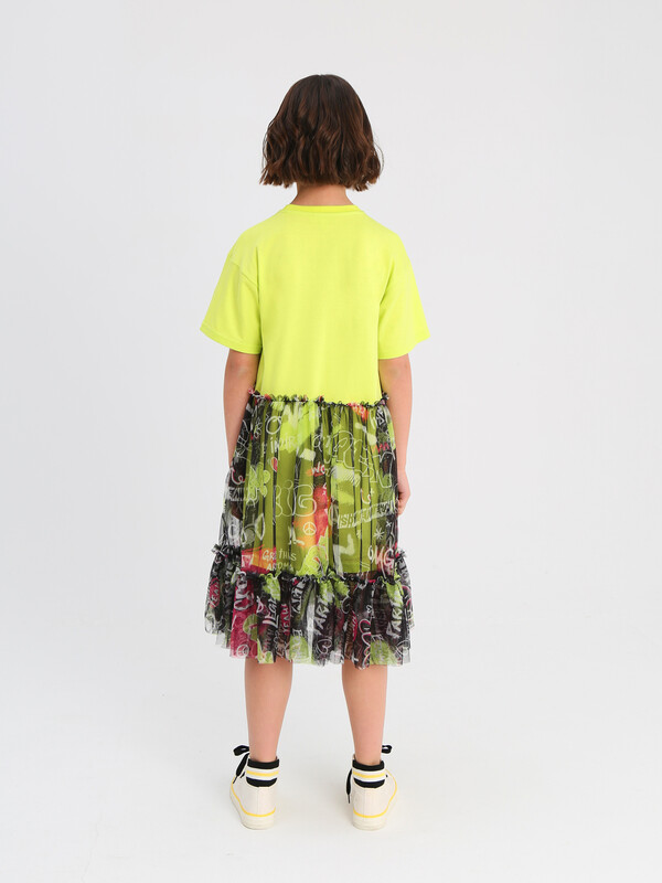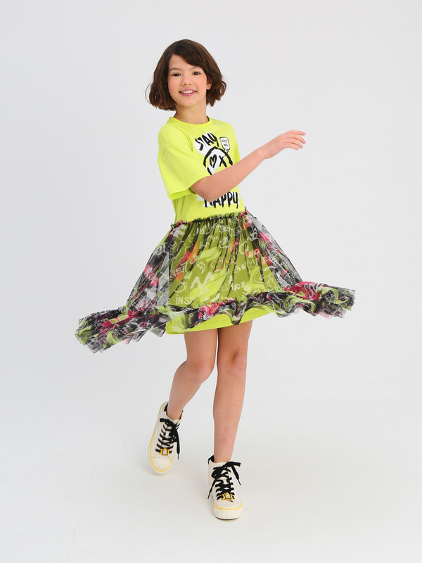 Модное платье-футболка с юбкой из сетки подойдет для ярких летних образов юной модницы. Нежная ткань из трикотажа приятно прилегает к телу, хорошо тянется и обладает высокой воздухопроницаемостью. Благодаря свободному крою оверсайз, платье отлично подойдет для активных игр ребенка и повседневных прогулок. Платье-футболка в спортивном стиле — это тренд, который актуален уже не первый сезон, а сетчатая юбка со стильным принтом сделает образ оригинальным.