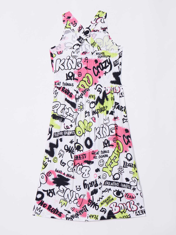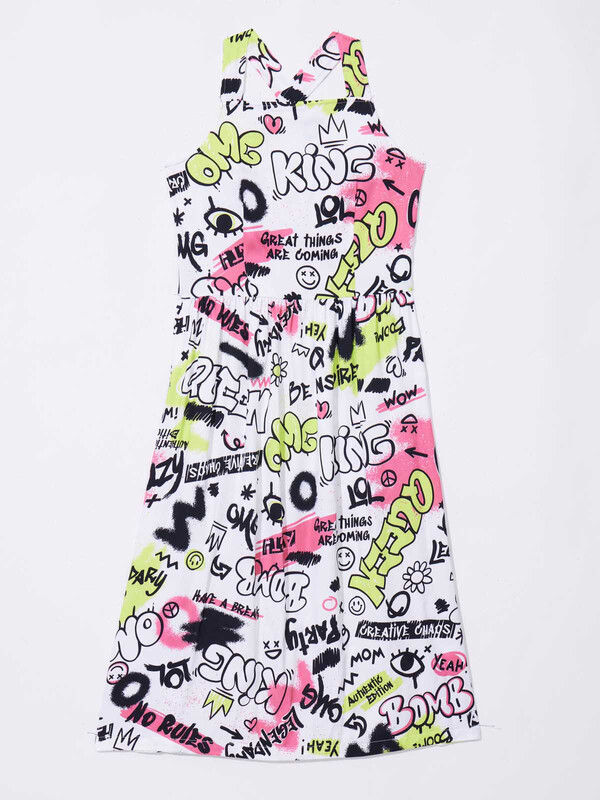 Стильный летний сарафан на бретелях — отличный вариант для девочки-подростка. Оно выполнено из качественной вискозы, которая отлично отводит влагу и не раздражает кожу. Благодаря свободному крою юбки, платье отлично подойдет для активных игр ребенка и повседневных прогулок. Оно выполнено в стиле граффити с текстовыми надписями для создания трендового образа.