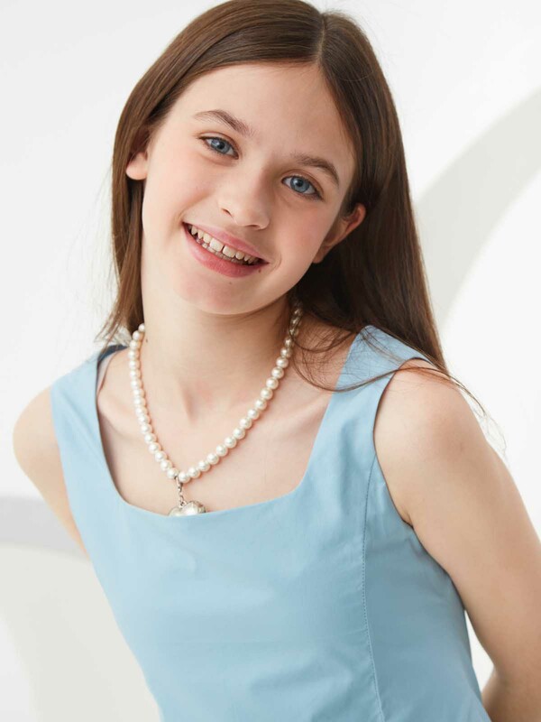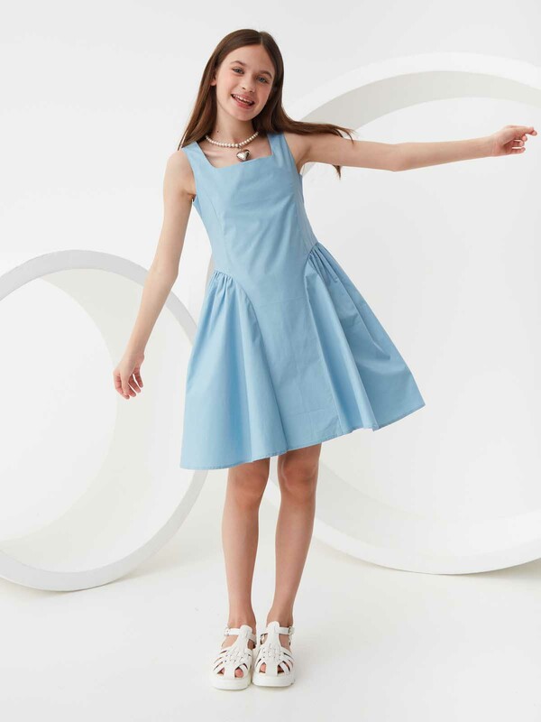 Платье из 100% хлопка в романтичном стиле. Подклад лифа и юбки из 100% хлопка. Застежка на потайную молнию на спинке. Перед и спинка платья с рельефными швами. К боковым участкам переда и спинки платья притачаны клинья со сборкой. Размерный ряд 128 – 176 см.