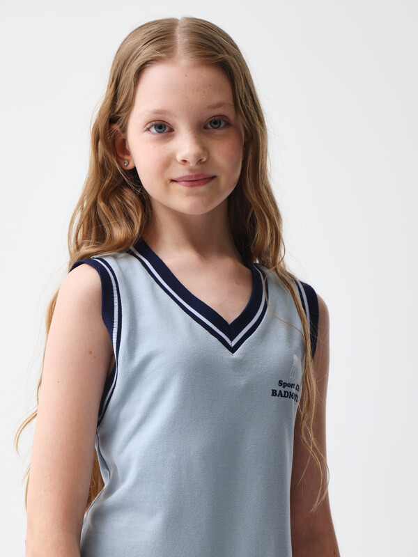 Короткое платье в теннисном стиле. Мягкий хлопковый трикотаж пике. Трапециевидный крой с отрезной талией и расклешенной юбкой. V-образный вырез. Декоративная полоска на воротнике, в проймах и по линии талии. На груди контрастный принт воланчика и надписью SPORT CLUB BADMINTON (с англ. «спортивный клуб бадминтона»). Размерный ряд 128 – 176 см.