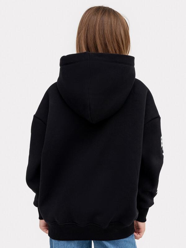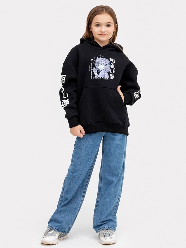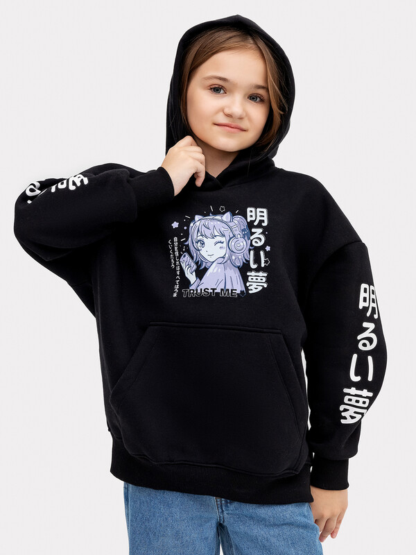 Анорак изготовлен из трикотажного полотна футер. Анорак свободного силуэта (оверсайз), с капюшоном. Горловина округлой формы. Капюшон со средним швом, на подкладке из осн. полотна. Плечо спущено, рукав втачной длинный. По низу рукава отрезная манжета из рибаны.