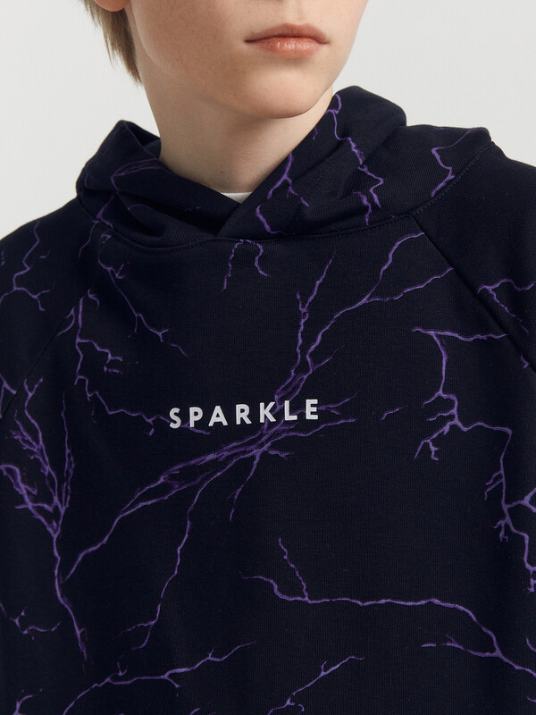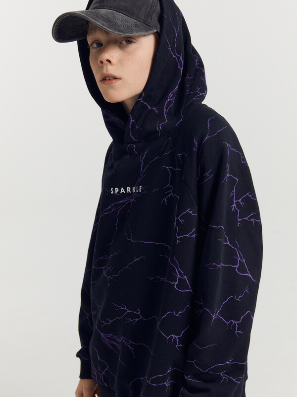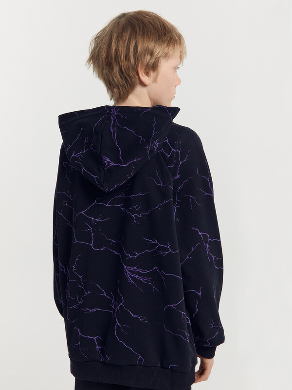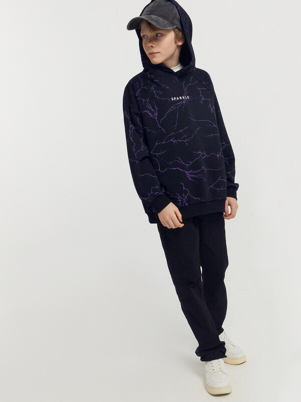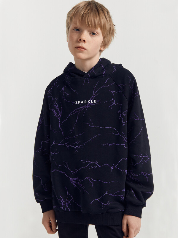 Утепленное худи для мальчиков, выполненное из трикотажного футера с теплым и нежным подчесом. Силуэт прямой, расслабленный. Вырез круглый, с объемным капюшоном. Рукава длинные и объемные, с манжетами. Мальчику наверняка понравятся принты и цвет этого худи!