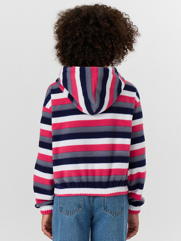 Укороченный анорак из флиса. Силуэт свободный, пройма спущена. Рукава длинные, втачные. Горловина круглой формы, втачан капюшон. По низу изделия и низу рукавов застрочена эластичная тесьма.