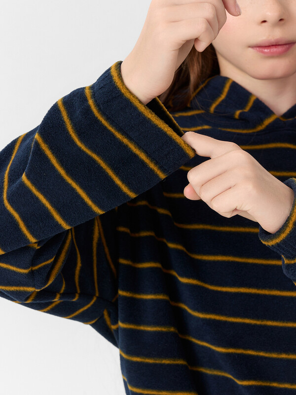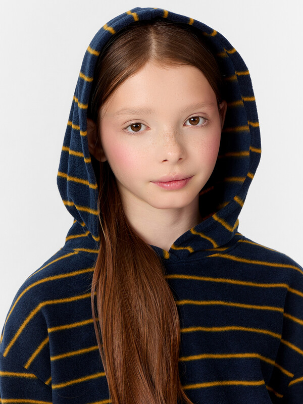 Укороченный анорак из флиса. Силуэт свободный, пройма спущена. Рукава длинные, втачные. Горловина круглой формы, втачан капюшон. По низу изделия и низу рукавов застрочена эластичная тесьма.