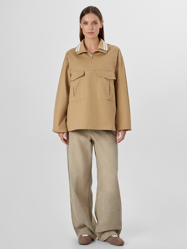 Воротник со стойкой и декоративным элементом добавляет куртке индивидуальности. Центральная молния, накладные карманы с клапанами и боковые карманы делают анорак практичным для повседневной носки — в них удобно хранить телефон, ключи или руки. Низ куртки обработан эластичной резинкой, которая мягко фиксирует изделие по фигуре.
