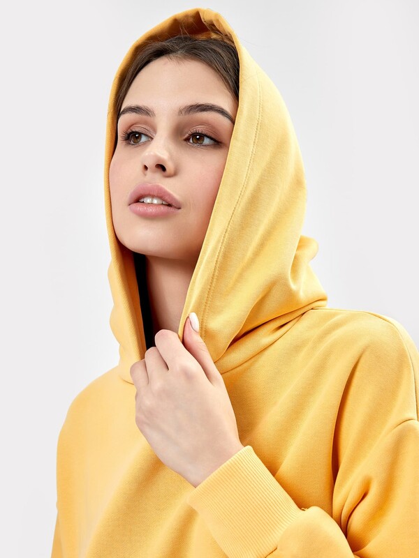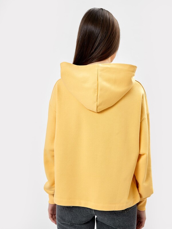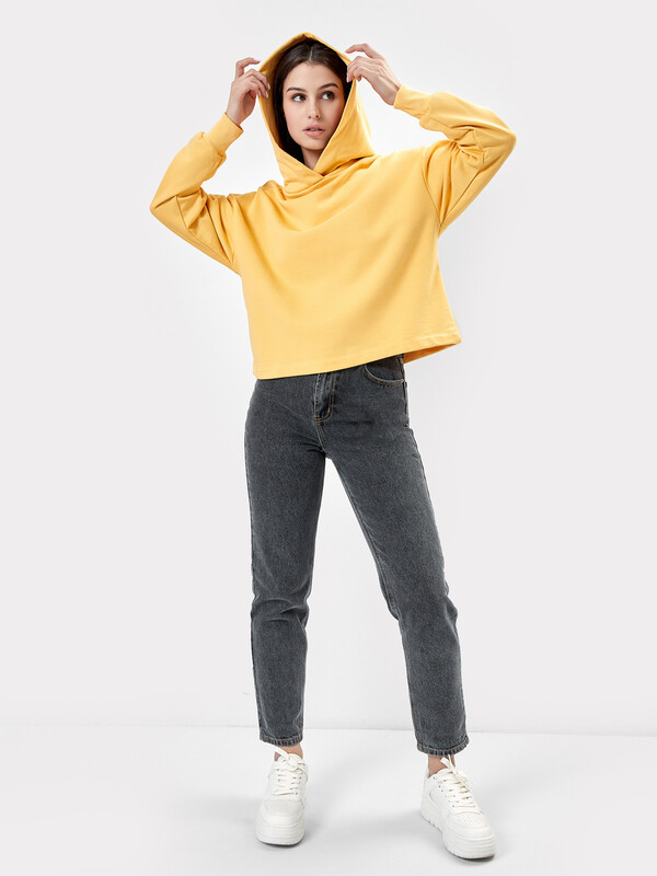 Укороченное спортивное худи из футера с теплым подчесом. Натуральный хлопок в составе полотна дополнен полиэстером – для прочности и долговечности. Силуэт оверсайз. Спущенная линия плеча и углубленная пройма дарят свободу движений. Уютный капюшон и манжеты на длинных рукавах защитят от ветра. Отличное худи для спортивных занятий, домашнего отдыха и прогулок.