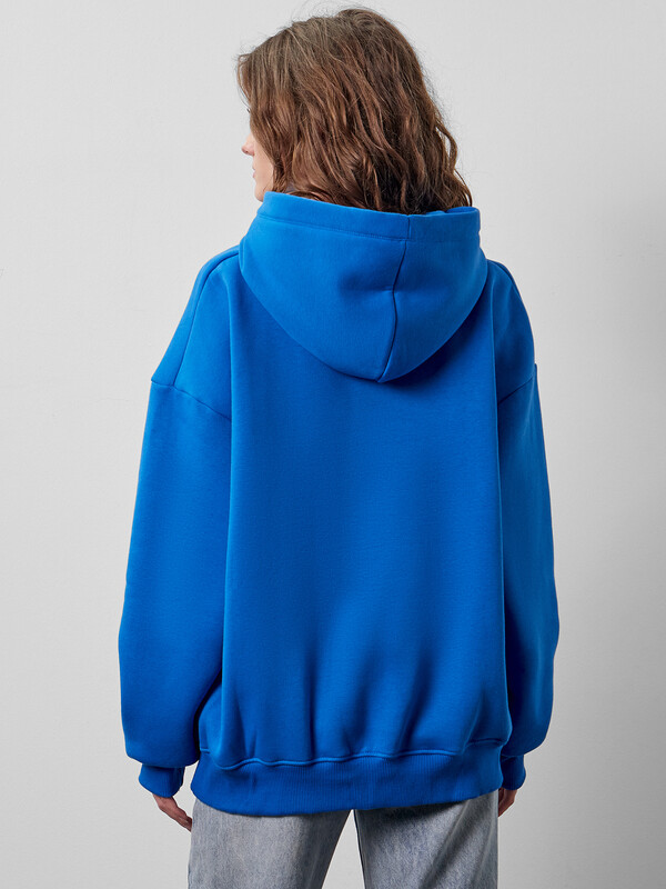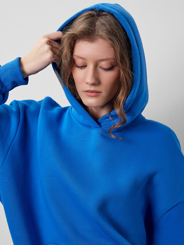 Анорак изготовлен из трикотажного полотна футер. Анорак свободного силуэта (оверсайз), с капюшоном. Горловина округлой формы. Капюшон со средним швом, на подкладке из осн. полотна. Плечо спущено, рукав втачной длинный. По низу рукава отрезная манжета из рибаны.
