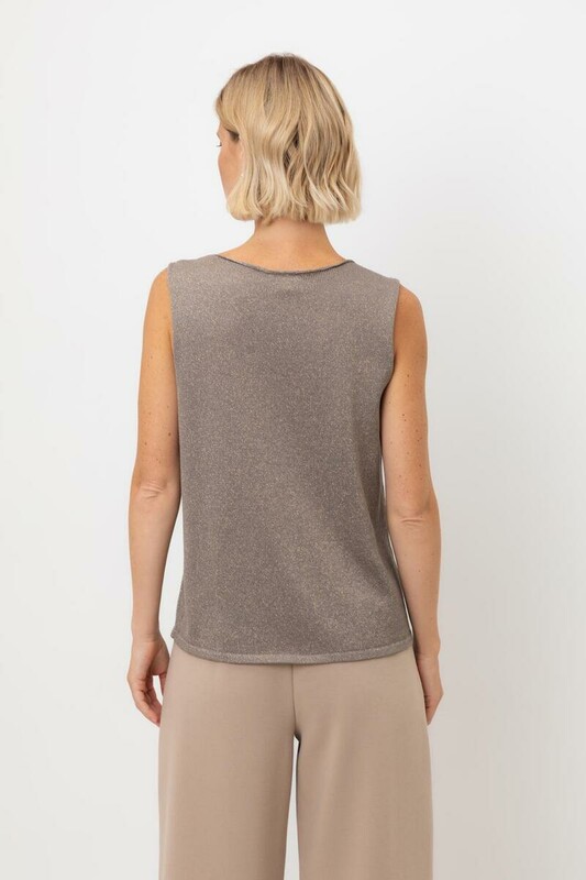 Гладкий топ из итальянской вискозы с метанитом дополнен глубокой линией декольте и аккуратным накладным карманом. Бежевый оттенок, нити метонита, придающие умеренный блеск, позволяют использовать изделие при создании разных образов.