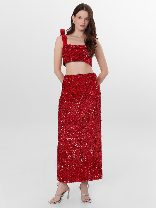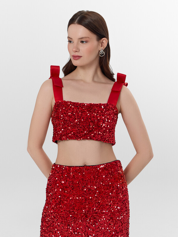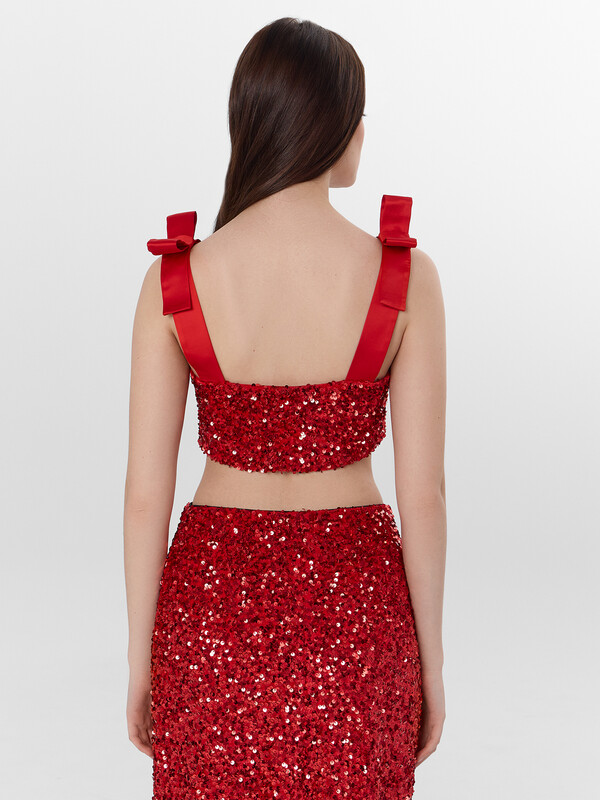Блуза женская, выполнена велюра с пайетками. Блуза прилегающего силуэта короткая, на широких бретелях из ткани с бантами. Блуза на подкладке из интерлока. По нижнему срезу притачена эластичная тесьма жаккард 35мм ( JT1-35)