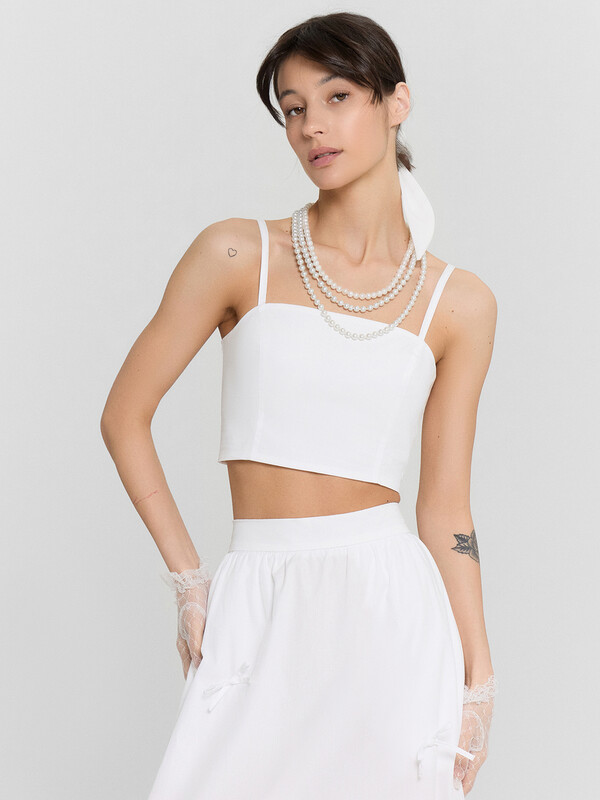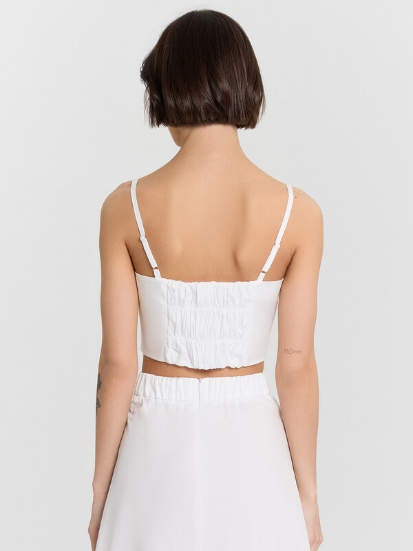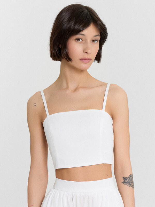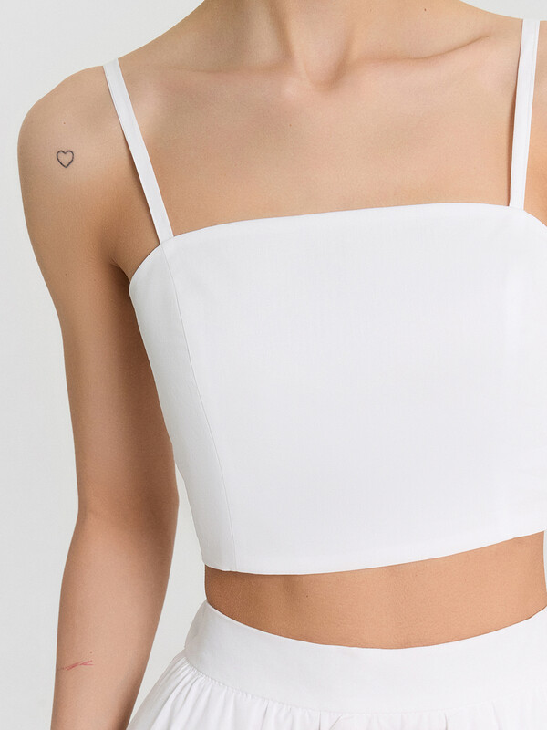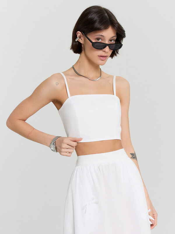 Блуза прилегающего силуэта на тонких бретелях. Бретели с регулировкой (на кольца и регуляторы пластик 10мм). Блуза на подкладке из основного полотна. На детали переда рельефы. Спинка со сборкой на эластичную тесьму по центральной детали спинки (внутр. 6мм).