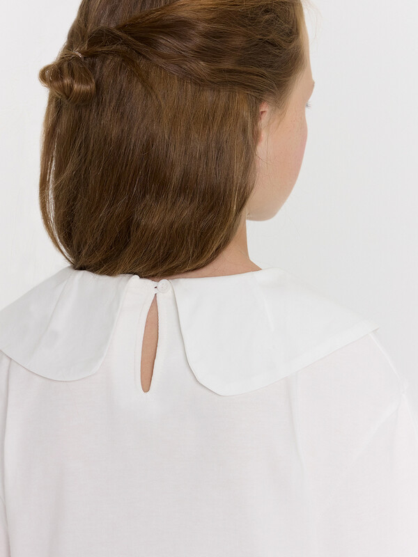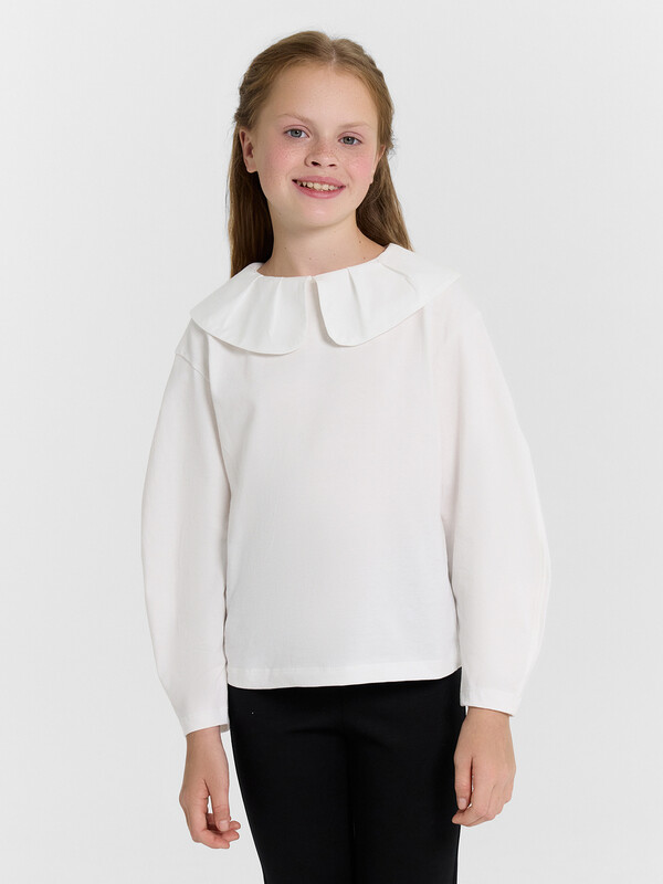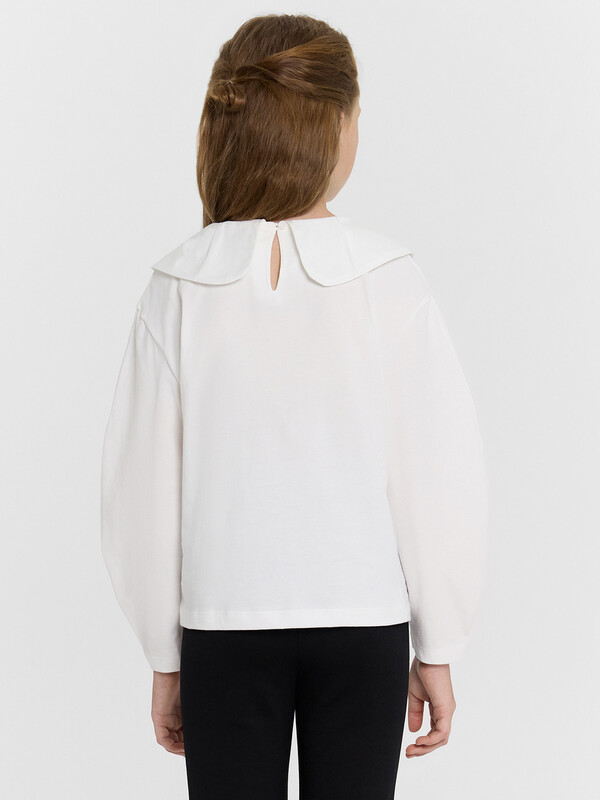 Блузка свободного силуэта. Рукава длинные втачные, с двумя швами. Горловина круглой формы с воротником из поплина. . Сзади изделия застежка - «капелька» на пуговицу d=10mm, петлю жилка вязаная 4 мм,жилка 13797K,KT1-4 . Низ рукавов и изделия обработаны на 2-х игольной плоскошовной машине швом в подгибку.