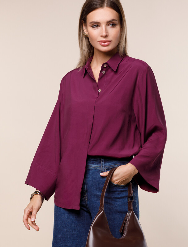 Блузка с отложным воротником и свободными укороченными рукавами выполнена из лиоцелла с вискозой. Лаконичная модель без декора, дополнена застежкой на пуговицы из натурального перламутра под планкой. Просторный крой не стесняющий движений подходит для любой фигуры с не широкими низами в заправку или поверх.
