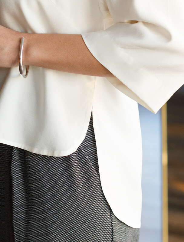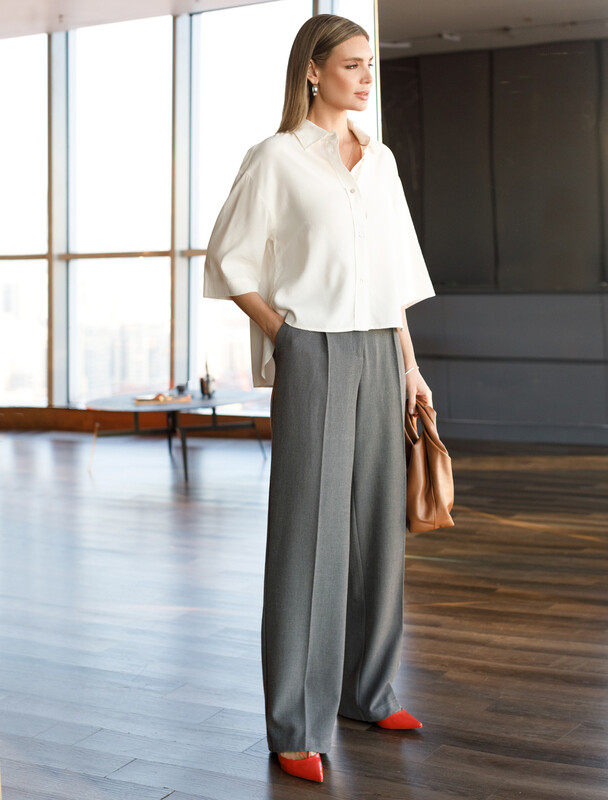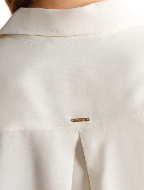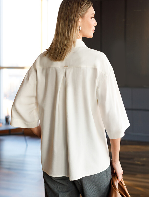 Летящая блузка с отложным воротником выполнена из премиальной вискозы и лиоцелла. Мягкий фактурный материал струится по телу. Вискоза обеспечивает отличную воздухопроницаемость и поддерживает комфортный микроклимат. Модель дополнена пуговицами из натурального перламутра, на спинке изделия металлический логотип бренда. Отлично впишется в нестрогий офисный дресс-код или в расслабленном повседневном образе с джинсами и юбками.