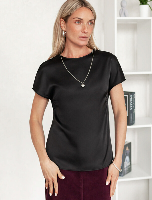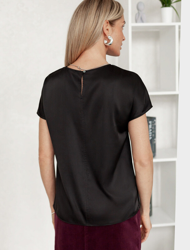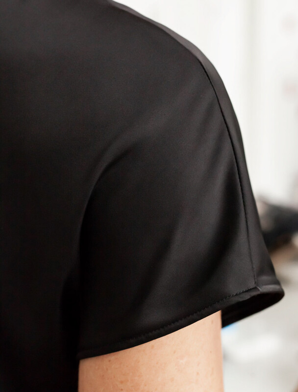 Стильная блузка черного цвета из сатина с удобной застежкой на пуговицу на спинке. Прямой крой и короткий рукав делают модель универсальной для любого сезона. Благородный блеск ткани подчеркивает элегантность, а удобная посадка обеспечивает комфорт. Благодаря эластану в составе ткань сохраняет первозданный вид, не образуя заломов. Ваш образ будет безупречен весь день! Блузка легко комбинируется с деловой одеждой и casual-вещами, подходит для разных случаев.
