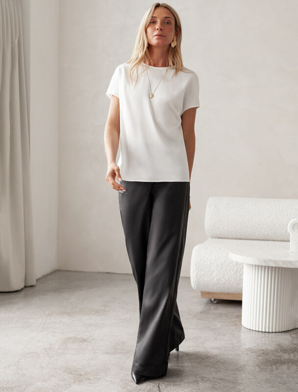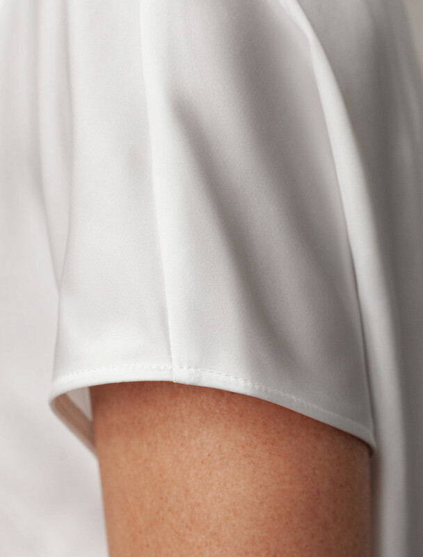 Стильная блузка черного цвета из сатина с удобной застежкой на пуговицу на спинке. Прямой крой и короткий рукав делают модель универсальной для любого сезона. Благородный блеск ткани подчеркивает элегантность, а удобная посадка обеспечивает комфорт. Благодаря эластану в составе ткань сохраняет первозданный вид, не образуя заломов. Ваш образ будет безупречен весь день! Блузка легко комбинируется с деловой одеждой и casual-вещами, подходит для разных случаев.