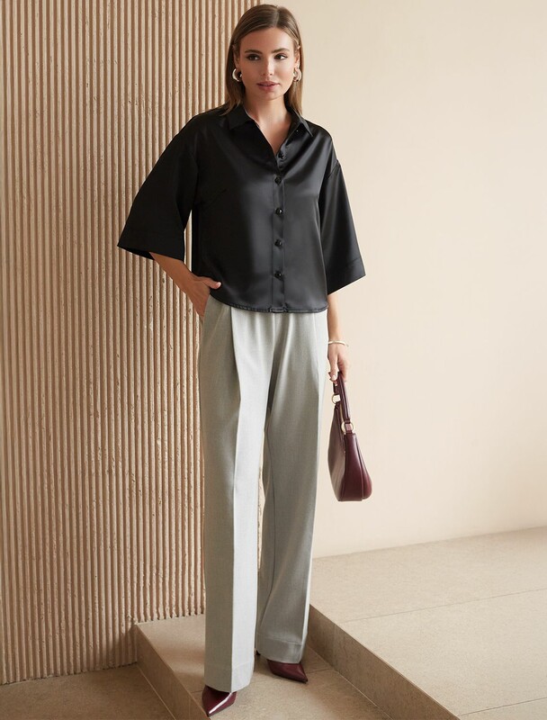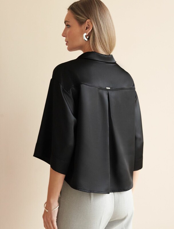 Элегантная блузка черного цвета на пуговицах выполнена из плотного струящегося сатина, который мягко ложится по фигуре и создает эффектную посадку. Отложной воротник придает образу женственную и изящную нотку. Материал отличается дышащей структурой, благодаря чему комфорт сохраняется даже в течение всего дня. Широкие рукава обеспечивают свободу движений и подходят для полных рук, делая блузку универсальной для разных типов фигур, в том числе для больших размеров. Красивая гладкая фактура материала подчеркивает утонченность изделия, добавляя легкое сияние к любому образу. Благодаря продуманному крою эта рубашка смотрится стильно как в повседневной жизни, так и на особых мероприятиях. Ткань практична, она приятна на ощупь, легко ухаживается и долго сохраняет первоначальный вид даже после многократных стирок и активной носки.
