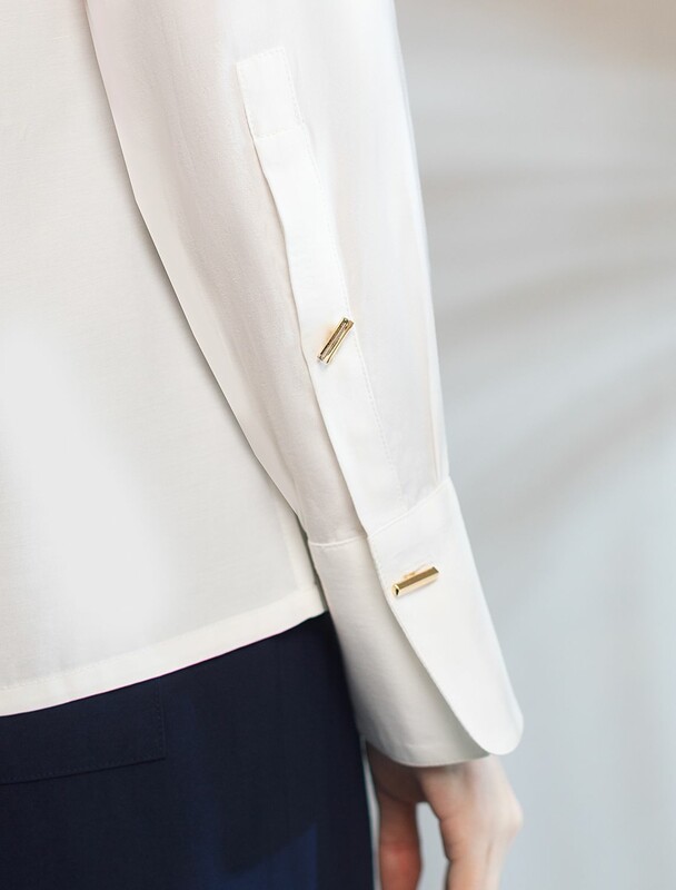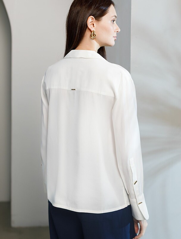 Блузка светло-оливкового цвета сочетает в себе комфорт и элегантность благодаря материалу из вискозы с лиоцеллом. Аккуратный отложной воротник подчеркивает утонченность образа, а продолговатые металлические пуговицы золотистого цвета добавляют выразительный акцент и придают блузке благородный вид. Широкие манжеты на рукавах привлекают внимание и делают силуэт современным. Спущенная линия плеча формирует расслабленный, но стильный внешний вид, что идеально для тех, кто ценит индивидуальность и уверенность в деталях. Крой продуман так, чтобы подчеркивать достоинства фигуры и на больших размерах, создавая гармоничный силуэт без лишних усилий. Ткань из вискозы с добавлением лиоцелла обеспечивает приятные ощущения и отличную посадку, струится на теле и охлаждает в жаркую погоду. Рубашка легко впишется как в деловой гардероб, так и в повседневный стиль, позволяя выглядеть безупречно независимо от ситуации.