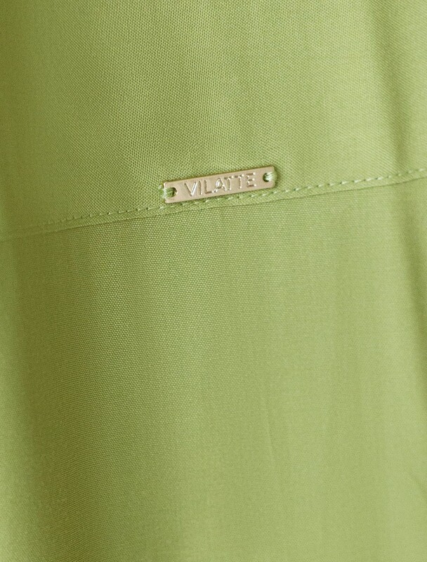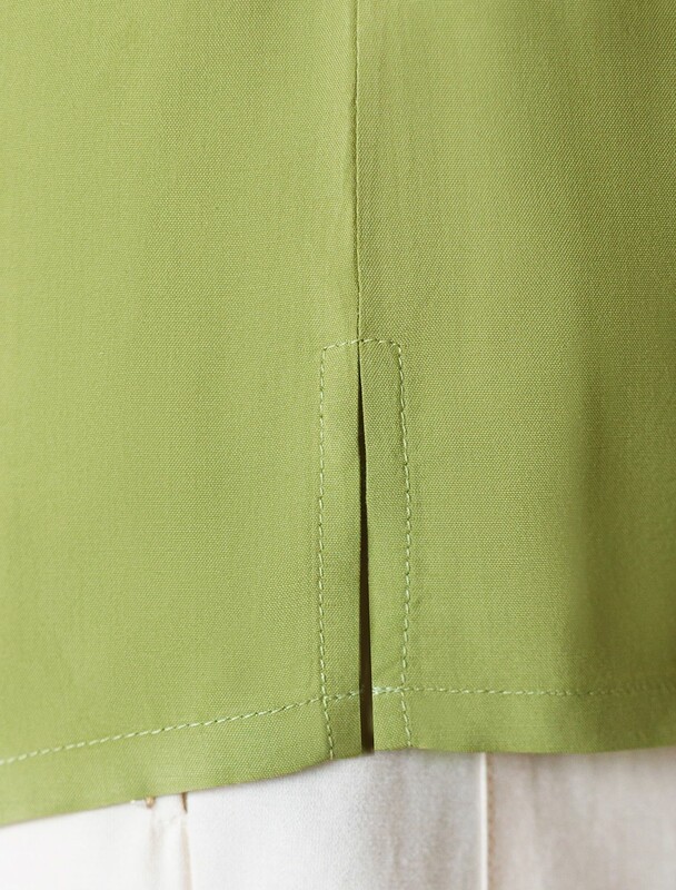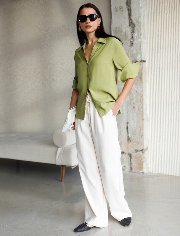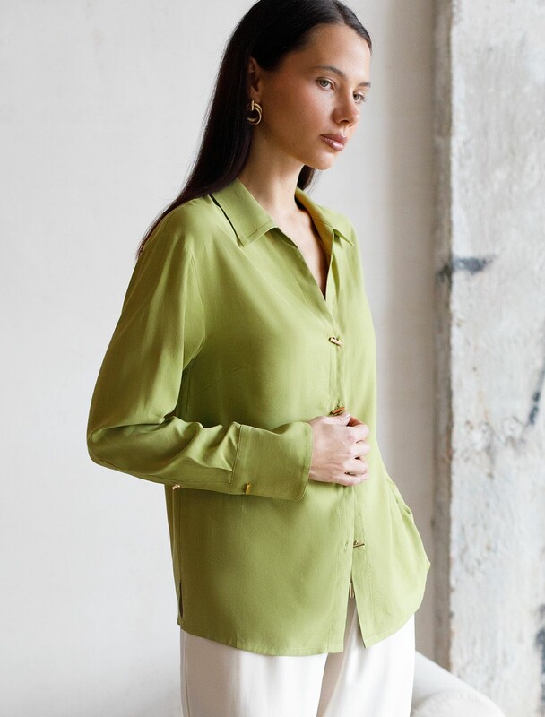 Блузка светло-оливкового цвета сочетает в себе комфорт и элегантность благодаря материалу из вискозы с лиоцеллом. Аккуратный отложной воротник подчеркивает утонченность образа, а продолговатые металлические пуговицы золотистого цвета добавляют выразительный акцент и  придают блузке благородный вид. Широкие манжеты на рукавах привлекают внимание и делают силуэт современным. Спущенная линия плеча формирует расслабленный, но стильный внешний вид, что идеально для тех, кто ценит индивидуальность и уверенность в деталях. Крой продуман так, чтобы подчеркивать достоинства фигуры и на больших размерах, создавая гармоничный силуэт без лишних усилий. Ткань из вискозы с добавлением лиоцелла обеспечивает приятные ощущения и отличную посадку, струится на теле и охлаждает в жаркую погоду. Рубашка легко впишется как в деловой гардероб, так и в повседневный стиль, позволяя выглядеть безупречно независимо от ситуации.