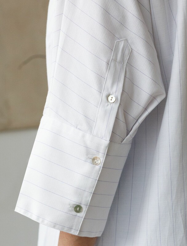 Стильная блузка молочного цвета в голубую полоску идеально держит форму и подчеркивает любую фигуру. Свободный крой с цельнокроеным рукавом 3/4 создает эффект легкой непринужденности и комфорта, а манжеты на рукавах добавляют аккуратности и завершенности образу. Отложной воротник придает блузке классическую нотку, которая гармонично сочетается в деловом образе. Хлопок с добавлением эластана гарантирует отличную посадку, подчеркивая достоинства и скрывая недостатки, при этом сохраняет свежесть на протяжении всего дня. Такая рубашка станет великолепным выбором для тех, кто ценит удобство и стиль одновременно. Модель удачно сочетается с различными предметами гардероба, позволяя создавать стильные и практичные образы в любую погоду.