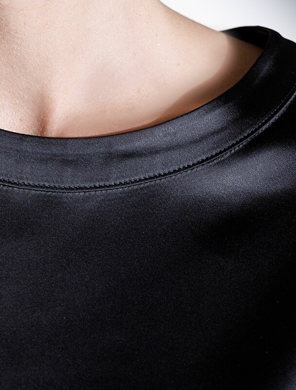 Блузка с короткими руквами черного цвета из струящегося плотного сатина создана для ценительниц комфорта и элегантности. Материал отличается высокой плотностью, что делает блузку устойчивой к износу и сохраняет аккуратный внешний вид даже при длительном использовании. Струящаяся ткань элегантно ложится по фигуре, подчеркивая достоинства силуэта без лишней утяжеленности, в тоже время приятно ощущается на теле.