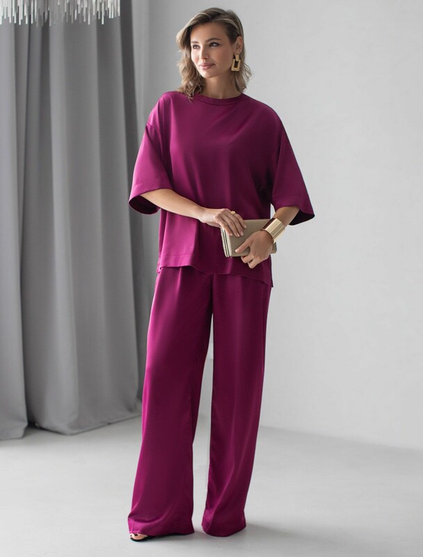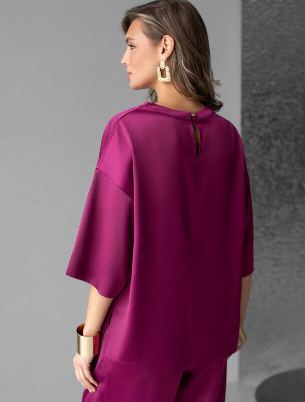 Свободный крой блузки и спущенная линия плеча дарят ощущение легкости и непринужденности, делая образ одновременно женственным и современным. Широкие рукава средней длины гармонично дополняют образ и идеально подходят для полных рук, обеспечивая комфорт, свободу движений и уверенность. Аккуратная застежка на маленькую пуговицу добавляет утонченности, а круглый вырез красиво обрамляет шею, создавая аккуратную линию декольте.
