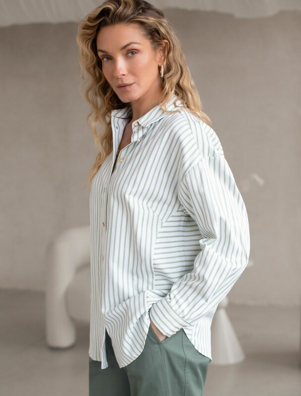 Главная страница - Каталог - Женская одежда оптом - Женская повседневная одежда - Женские блузки - Блузка свободного силуэта в тонкую полоску из эластичного хлопка с добавлением льна