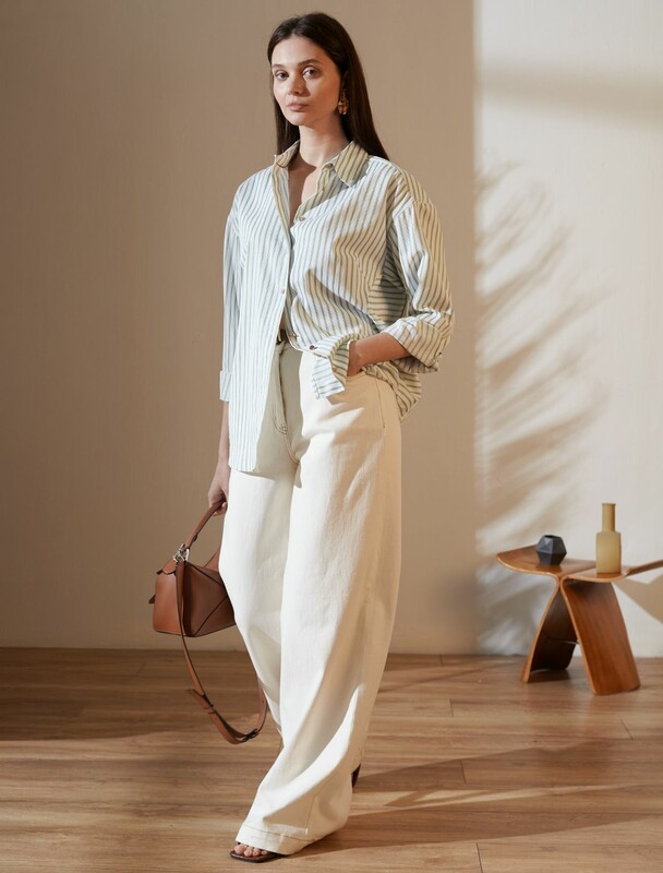 Блузка свободного силуэта в тонкую полоску из эластичного хлопка с добавлением льна