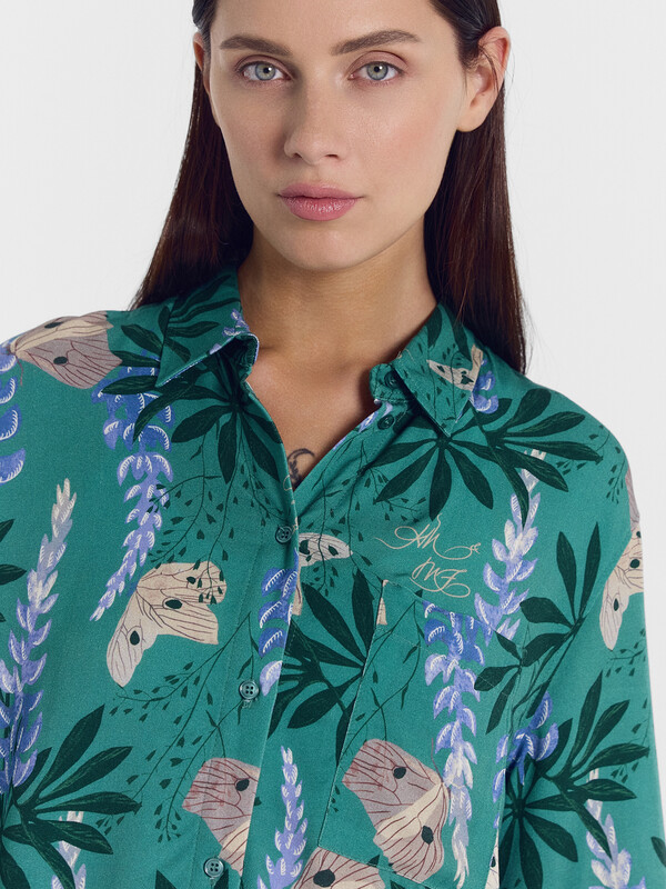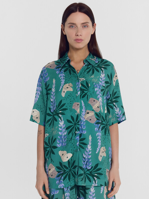 Блузка женская свободного силуэта из ткани. Блузка с цельнокроеной планкой и центральной застежкой на пуговицы. На левой детали переда накладной карман.