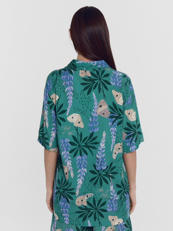 Горловина круглой формы с рубашечным воротником. Плечо спущено, пройма углублена. Рукав втачной, короткий. Низ рубашки прямой.