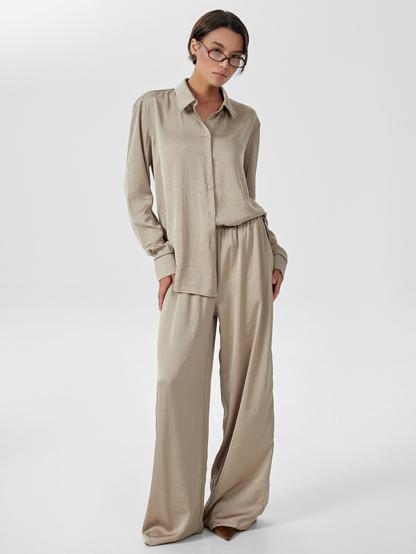 Блузка женская прямого силуэта из сатиновой ткани. Горловина круглой формы, в горловину втачан стояче-отложной воротник. Центральная застежка на пуговицы.
