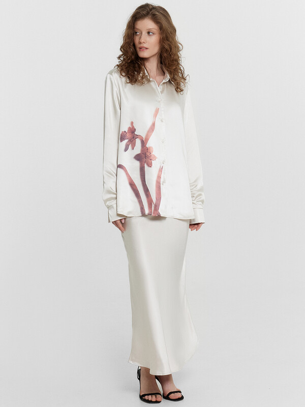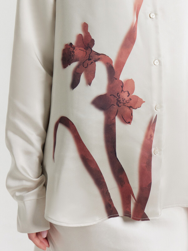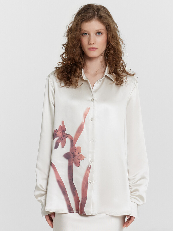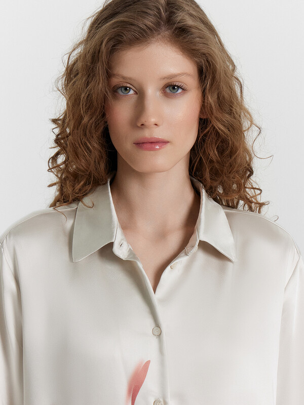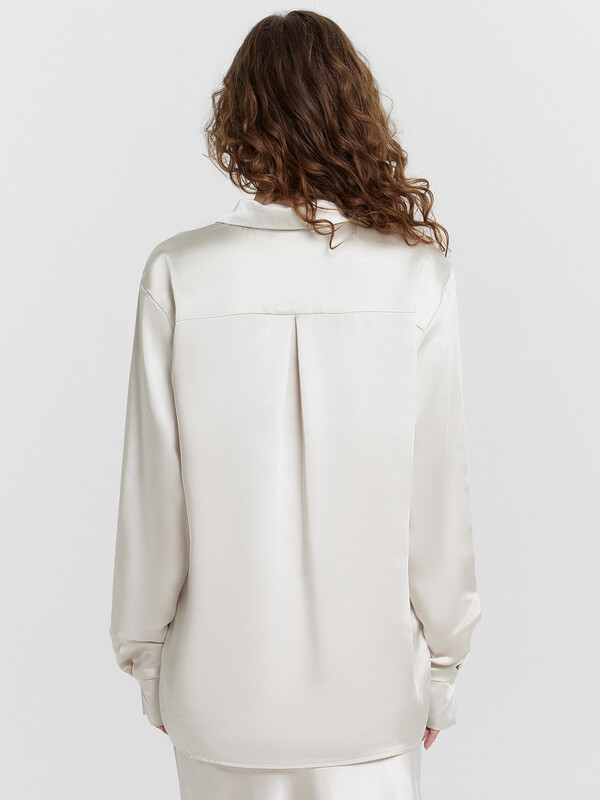 Блузка женская прямого силуэта из сатиновой ткани. Горловина круглой формы, в горловину втачан стояче-отложной воротник. Центральная застежка на пуговицы.