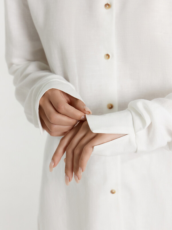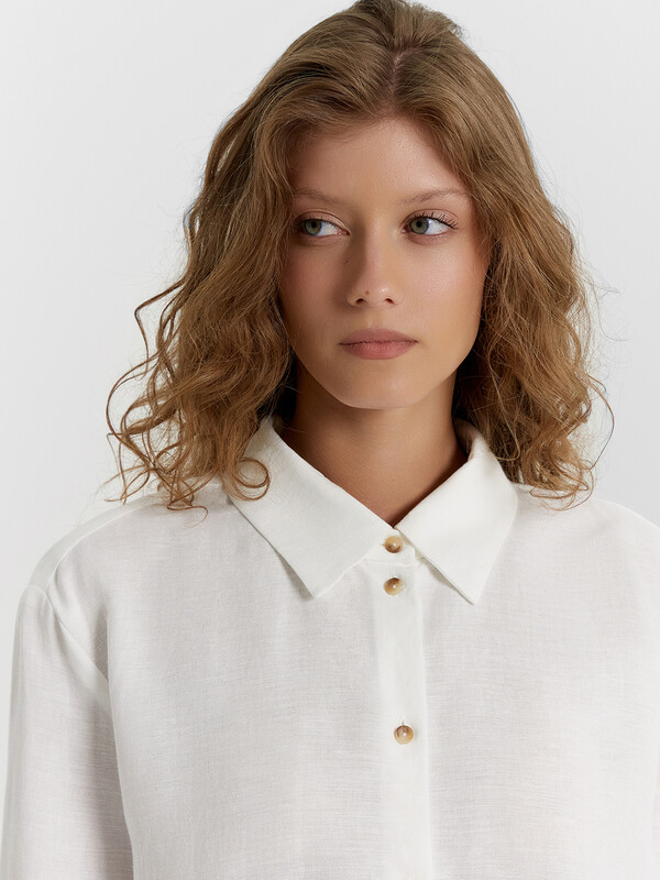Блузка женская прямого силуэта из сатиновой ткани. Горловина круглой формы, в горловину втачан стояче-отложной воротник. Центральная застежка на пуговицы.