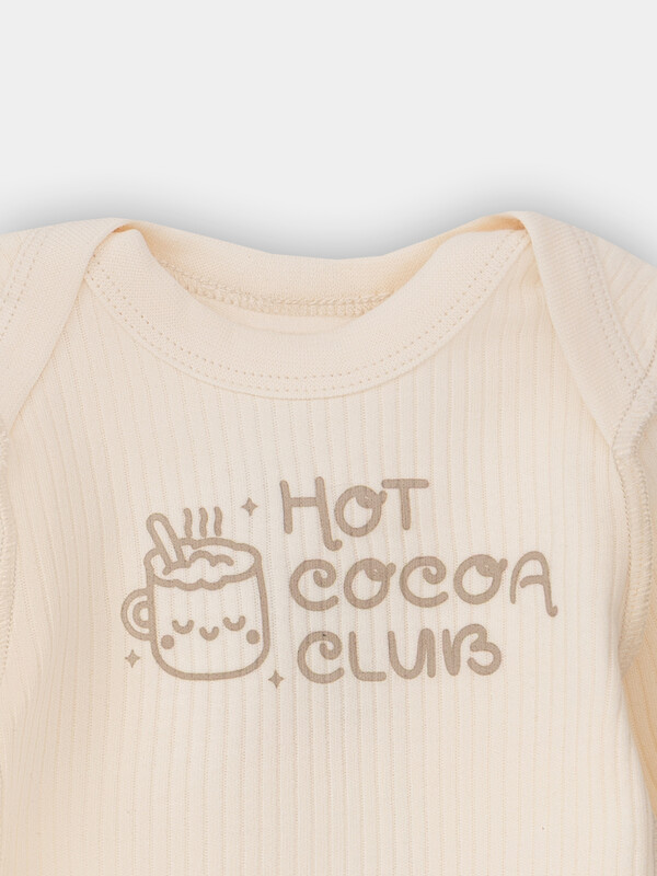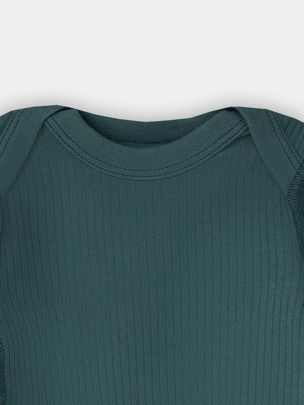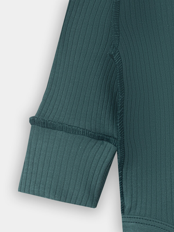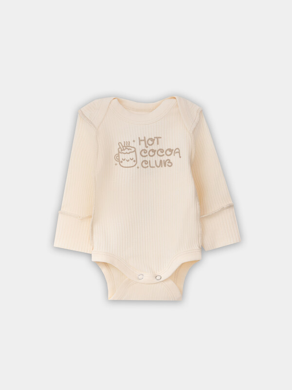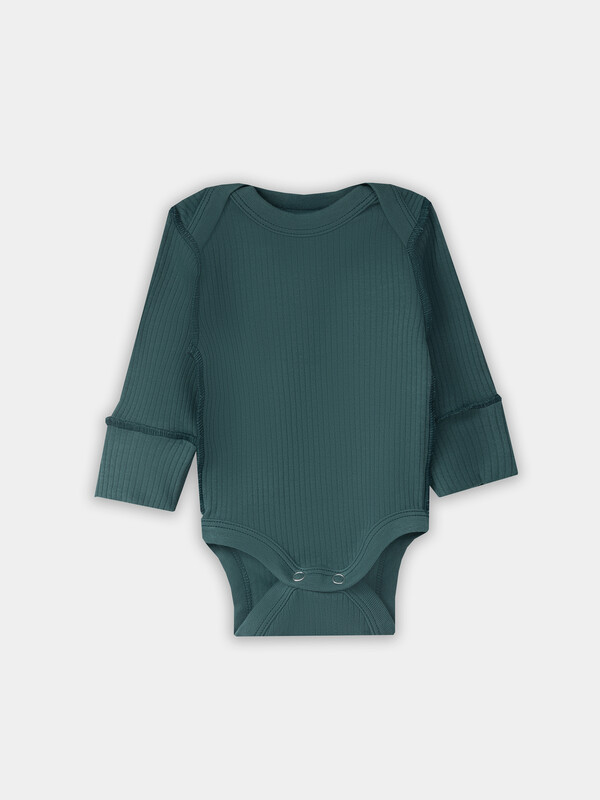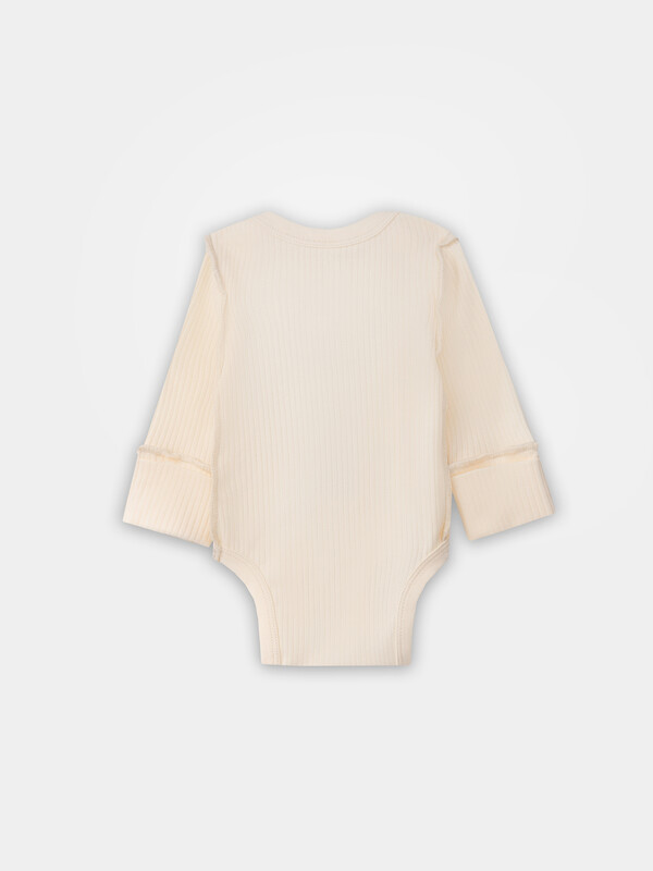 Круглая горловина и все срезы аккуратно окантованы мягкой бейкой, которая нежно прилегает к телу. Длинные рукава с защитными «царапками» надежно закрывают ручки малыша, предотвращая случайные царапины.