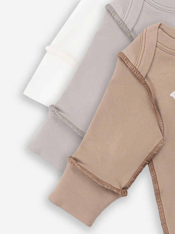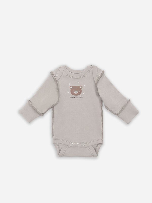 Круглая горловина с аккуратной окантовкой продумана для легкого одевания, а деликатные внешние швы добавляют современный дизайнерский штрих, оставаясь при этом мягкими и безопасными. Длинные рукава оснащены защитными царапками - практичное решение для малышей. Удобная застежка на кнопках по всей длине значительно упрощает процесс переодевания.