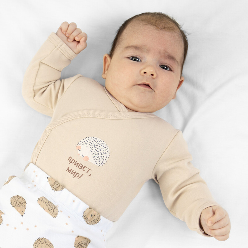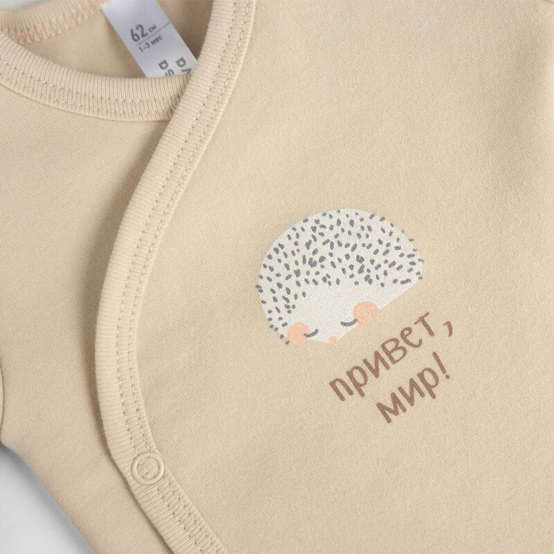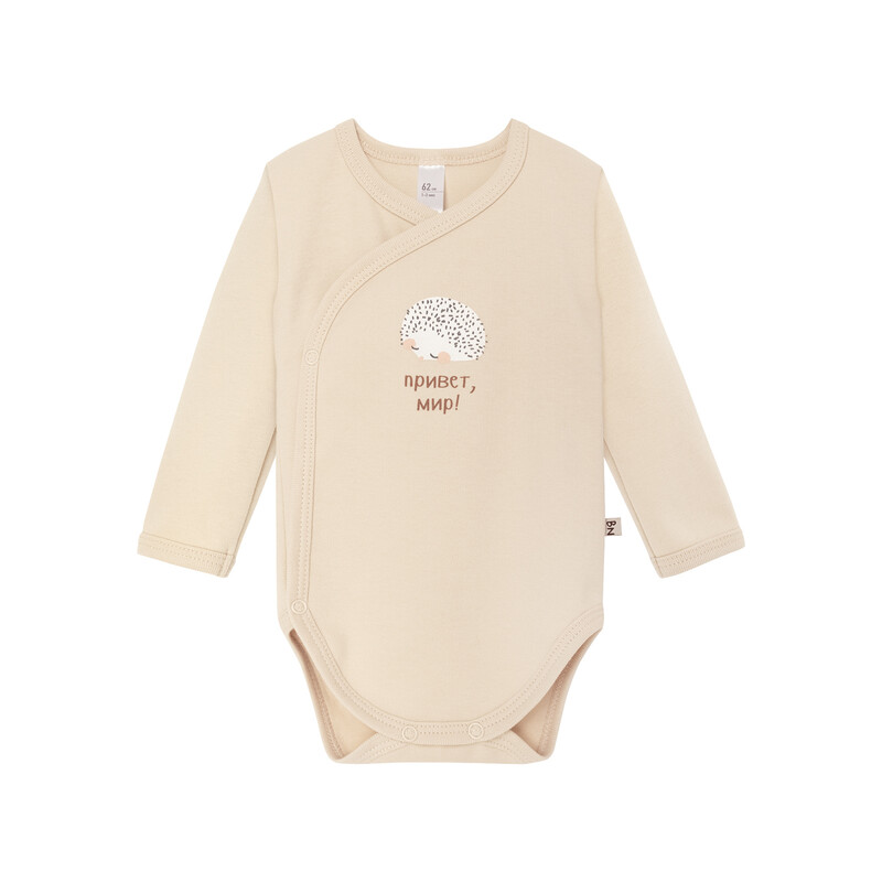 Боди с длинным рукавом Bossa Nova выполнен из интерлока. Детали: принт, модель на "запах", застёжка на кнопки сбоку и по низу изделия.