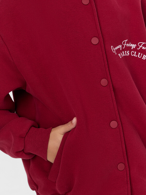 Бомбер свободного кроя. Круглый вырез горловины. В горловину втачан воротник-стойка из рибаны. Шов втачивания закрыт х/б тесьмой 10мм ,10TGY-O. Спереди застежка на кнопки 15 мм .Плечо спущено, пройма углубленна. Рукава втачные, длинные. По низу рукавов манжеты из рибаны. На деталях переда прорезные карманы . По низу изделия отрезной пояс из рибаны.