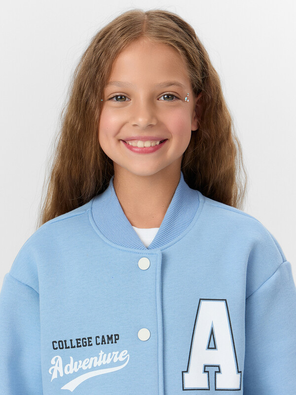 Бомбер свободного кроя. Круглый вырез горловины. В горловину втачан воротник-стойка из рибаны. Шов втачивания закрыт х/б тесьмой 10мм ,10TGY-O. Спереди застежка на кнопки 15 мм .Плечо спущено, пройма углубленна. Рукава втачные, длинные. По низу рукавов манжеты из рибаны. На деталях переда прорезные карманы . По низу изделия отрезной пояс из рибаны.